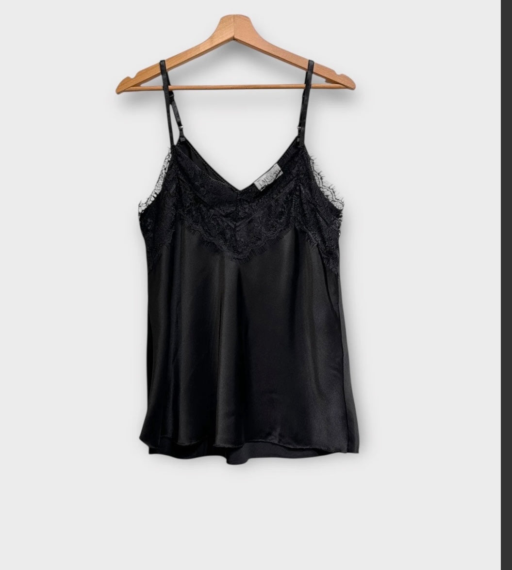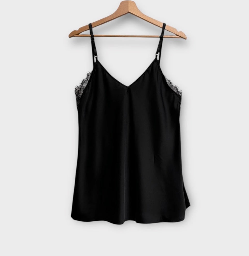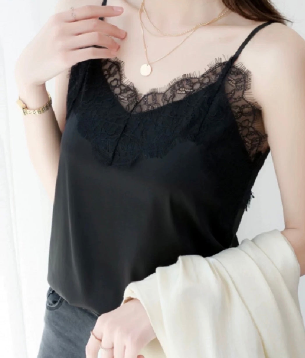 Hento yksivärinen toppi, jossa pitsiä ja säädettävät olkaimet.