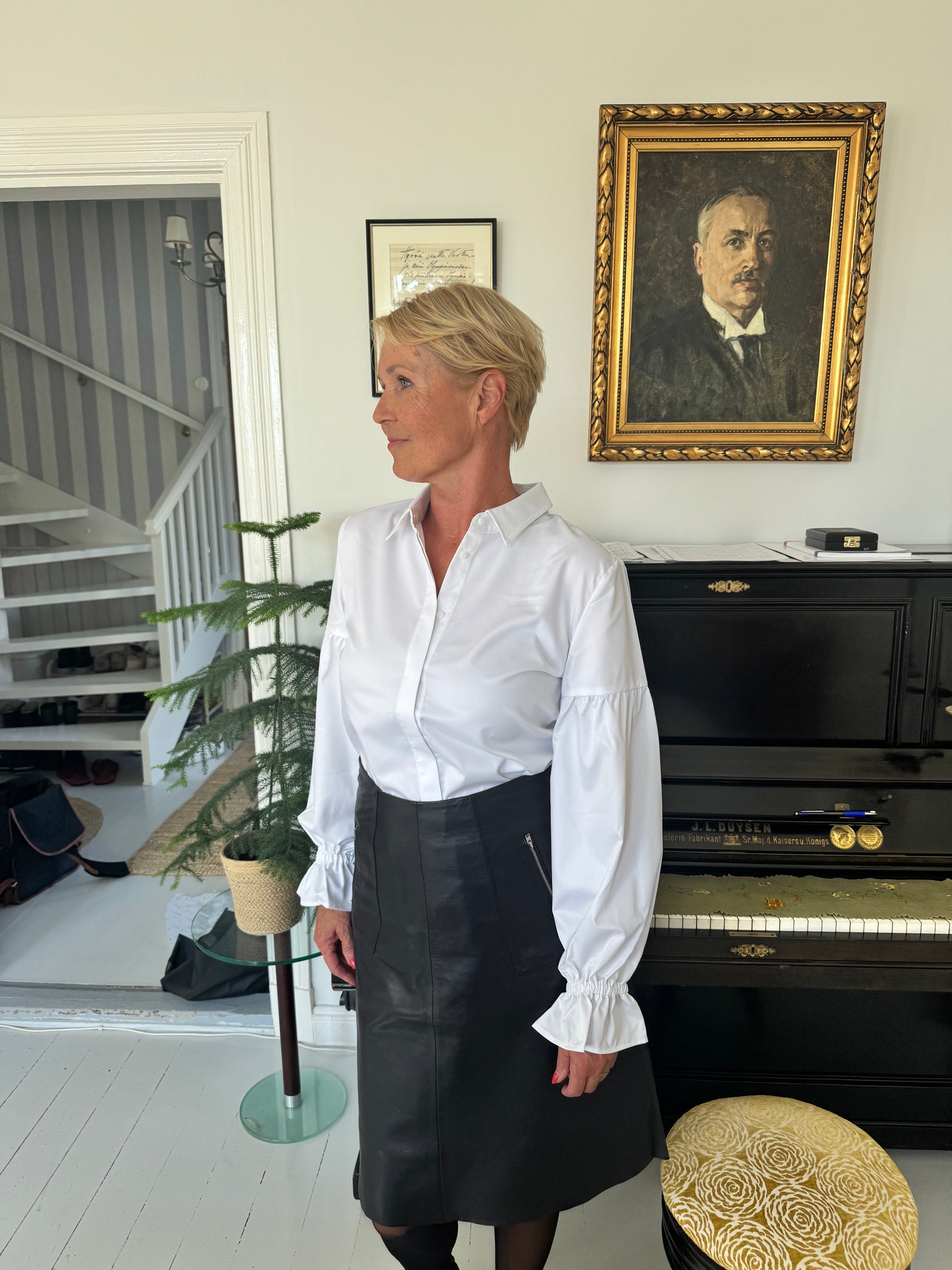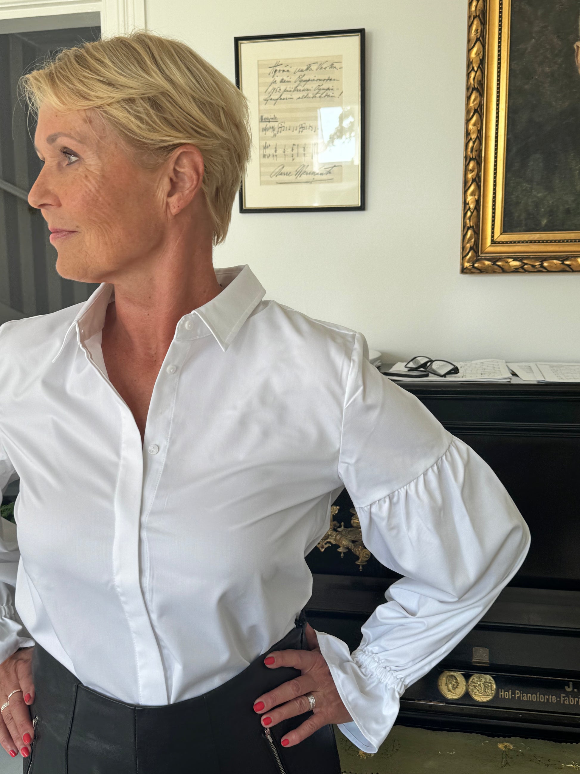 Paidassa on pitkät hihat, joissa on joustava hihansuu, joka muodostaa kauniin röyhelöreunan. Klassinen kaulus ja piilonapitus edessä viimeistelevät elegantin ja feminiinisen ilmeen, mikä tekee paidasta täydellisen valinnan kaikkiin tilanteisiin.