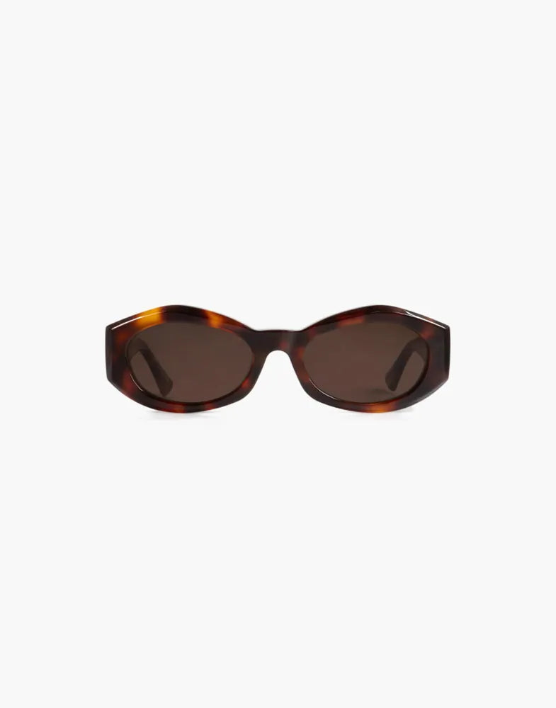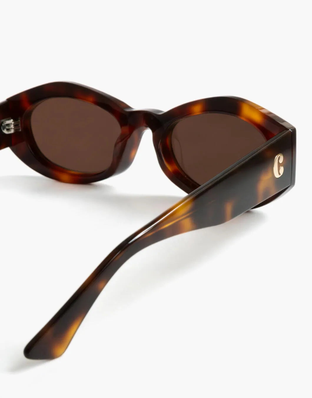 Celeste Tortoise ruskea yhdistää kissansilmämuodon ruskeaan väripalettiin. Rohkeilla linjoilla ja runsain mitoin muotoiltu malli tarjoaa näyttävän mutta viimeistellyn ilmeen, valmistettu korkealaatuisesta italialaisesta asetaatista.