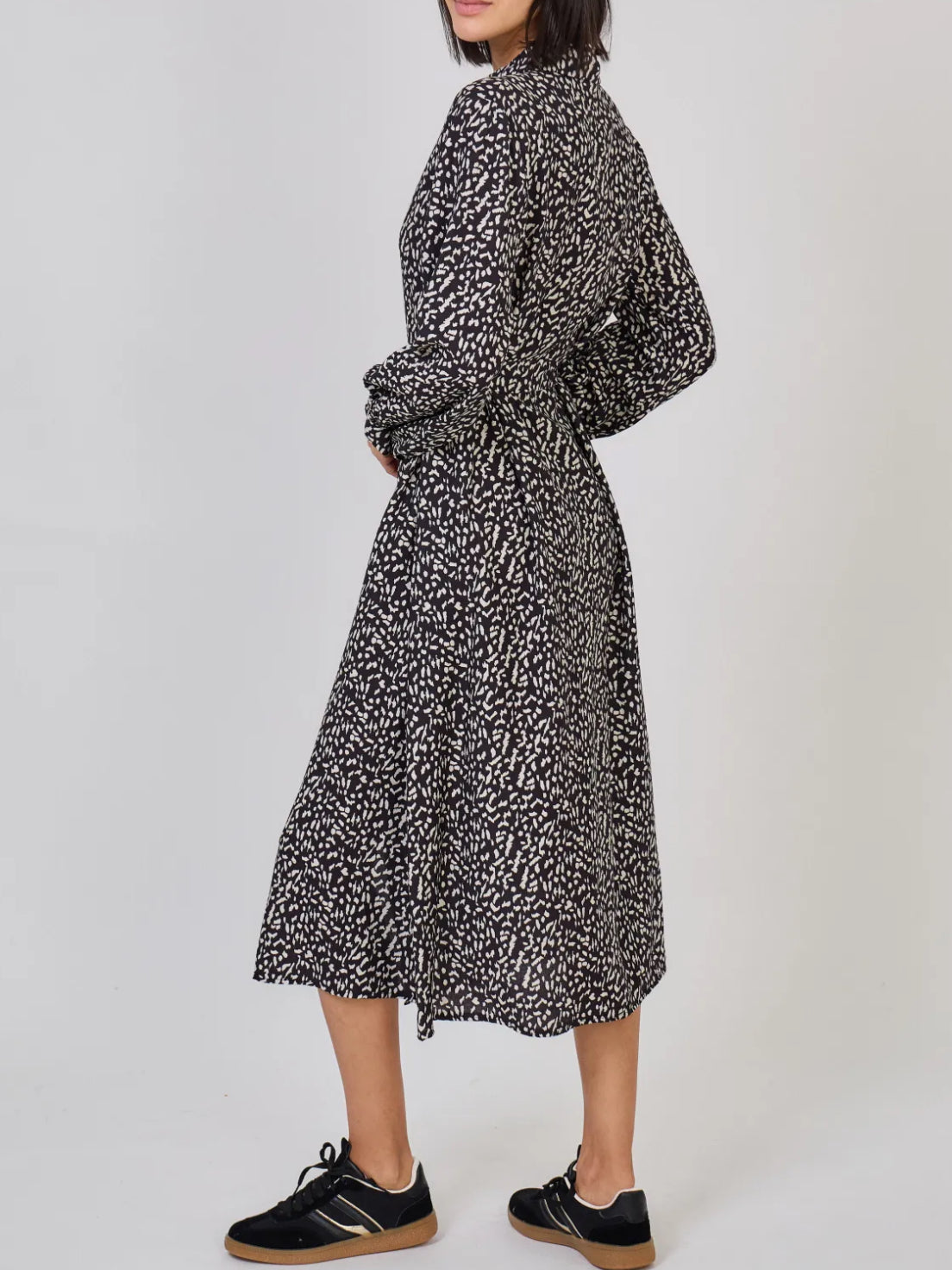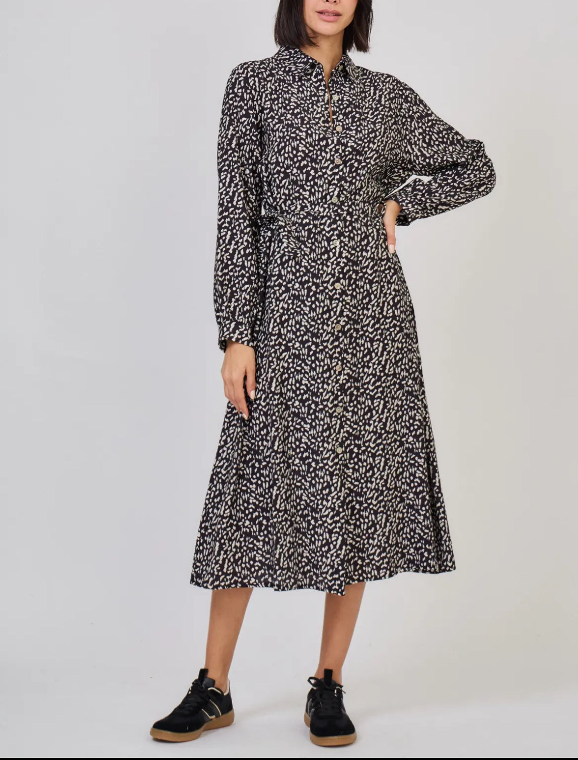 Pitkät hihat, kaulukset ja vyö viimeistelevät tyylikkään ilmeen. Polven alle ulottuva helma tekee mekosta elegantin ja mukavan jokapäiväiseen käyttöön.