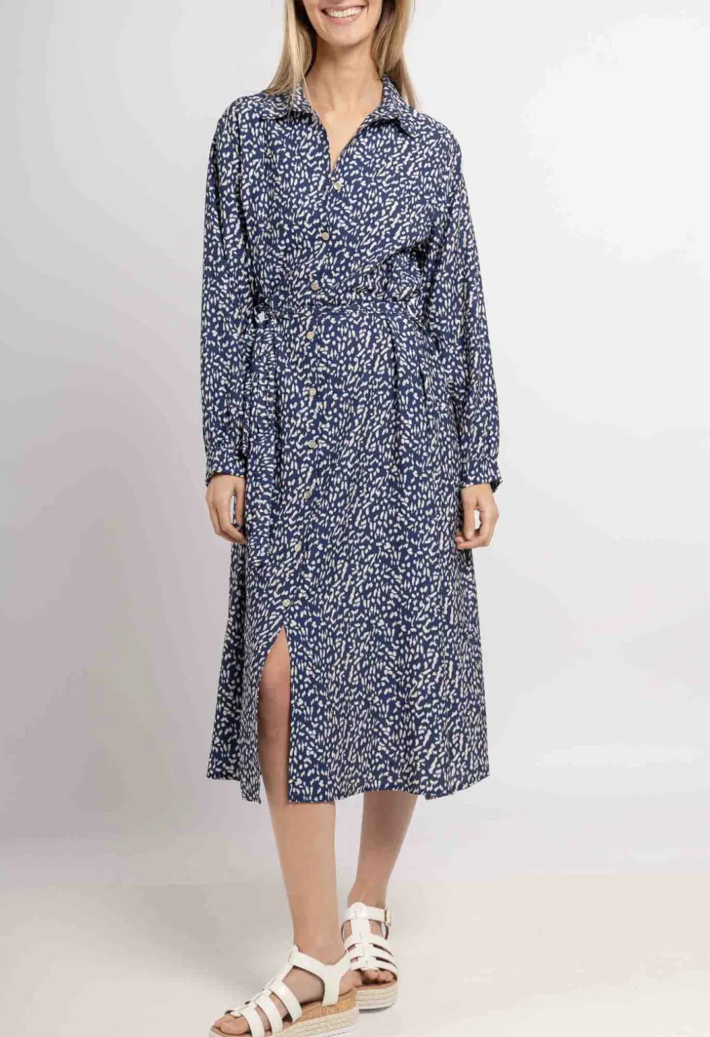 Pitkät hihat, kaulukset ja vyö viimeistelevät tyylikkään ilmeen. Polven alle ulottuva helma tekee mekosta elegantin ja mukavan jokapäiväiseen käyttöön.
