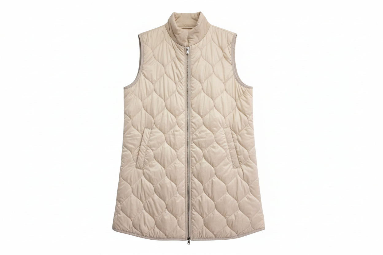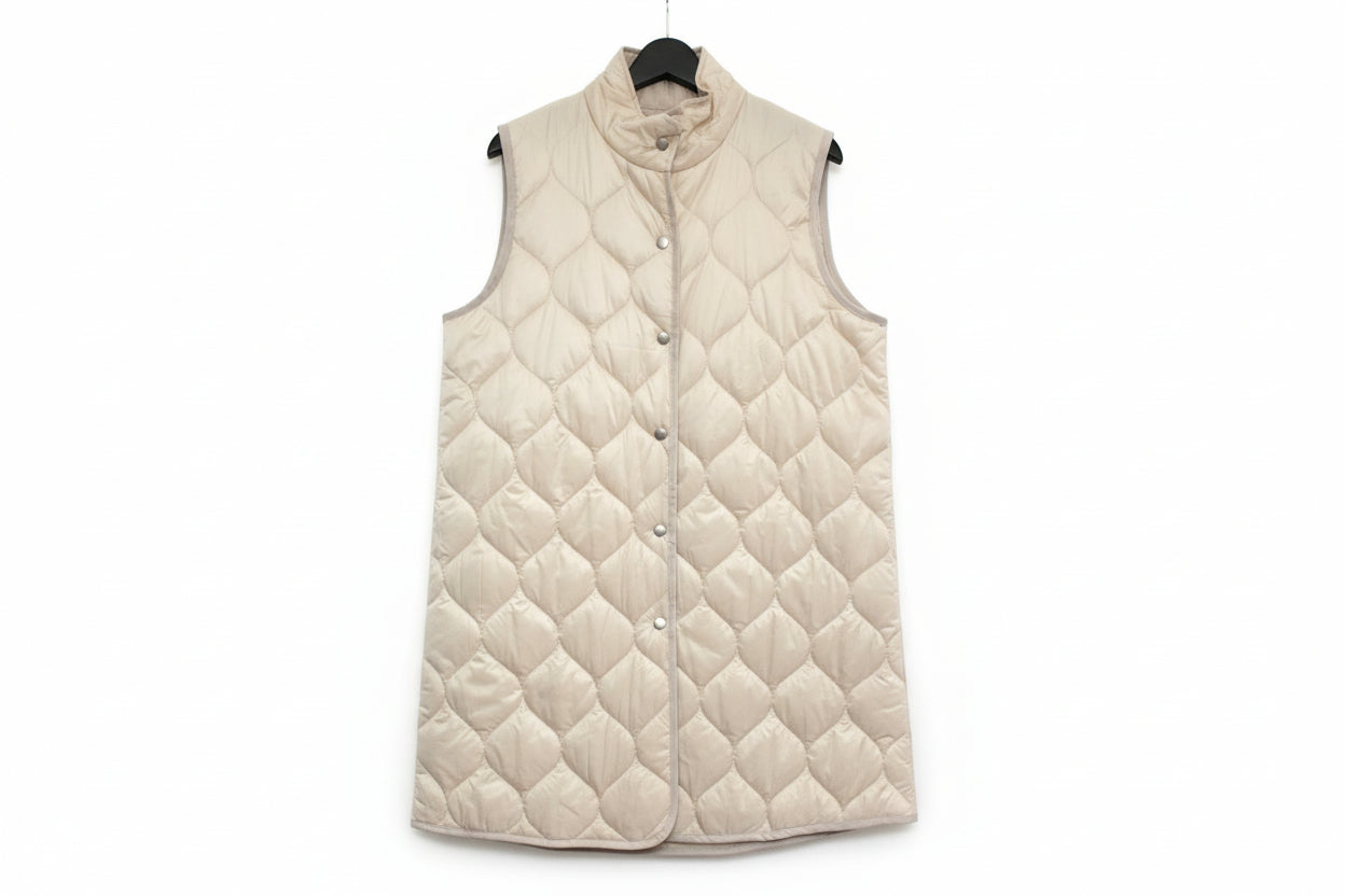 Ohut toppaliivi, kaunis kapea malli. Kevyt ja miellyttävä päällä, sopii erinomaisesti käytettäväksi takin alla tai sellaisenaan. Pystykaulus. Liivi on kiva kerrostaa eri asukokonaisuuksiin.