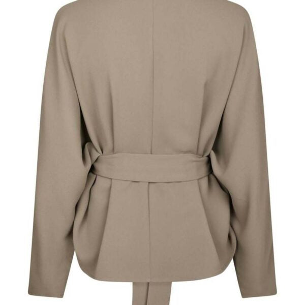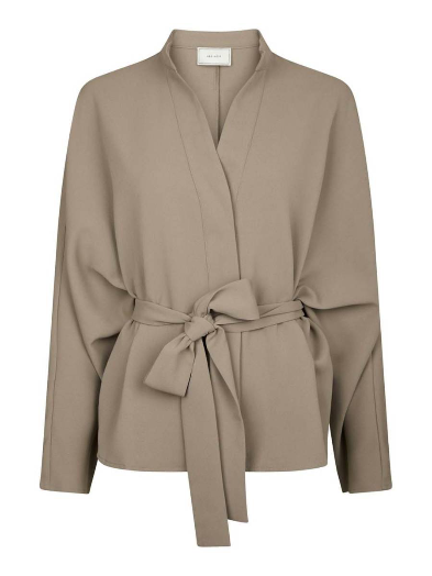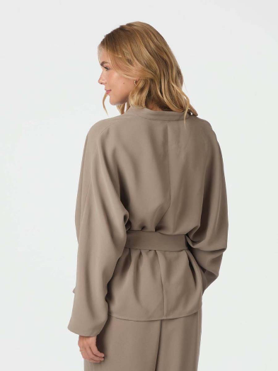 Ylisuuri ja väljä pusero, jossa vyö solmitaan vyötärölle. Malli on 176 cm pitkä ja käyttää kokoa .