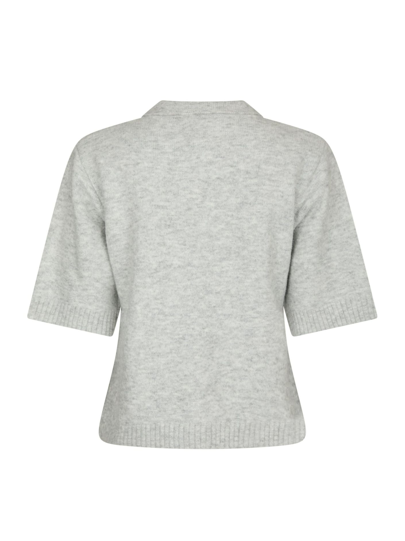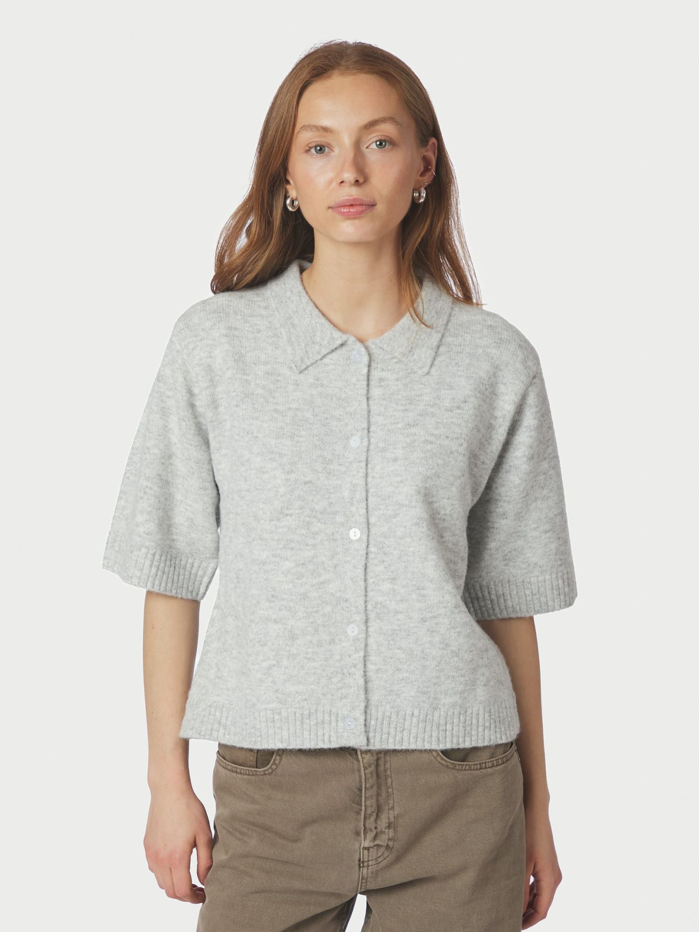 Lyhythihainen neulottu pusero, jossa kaulus ja napit edessä.