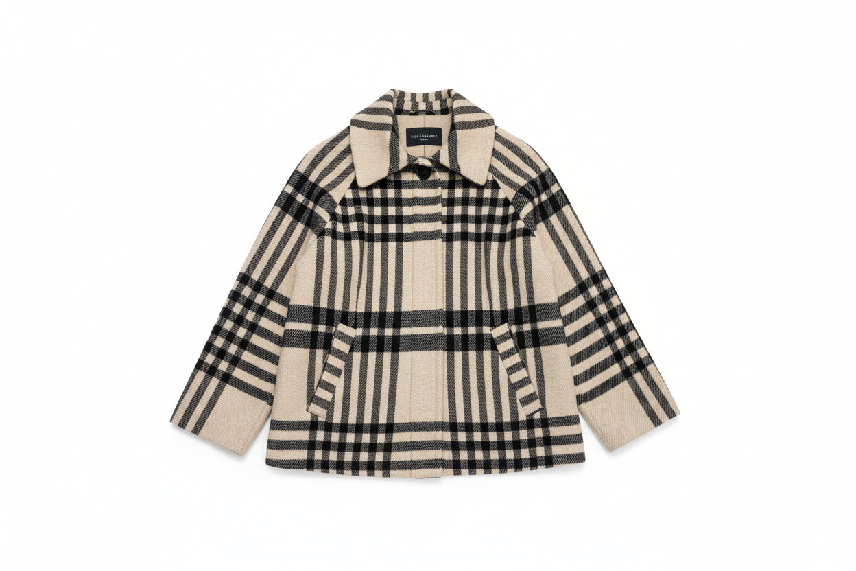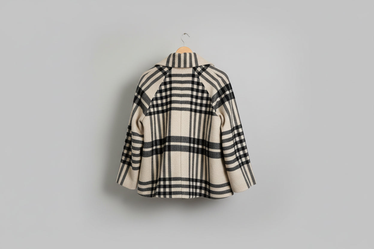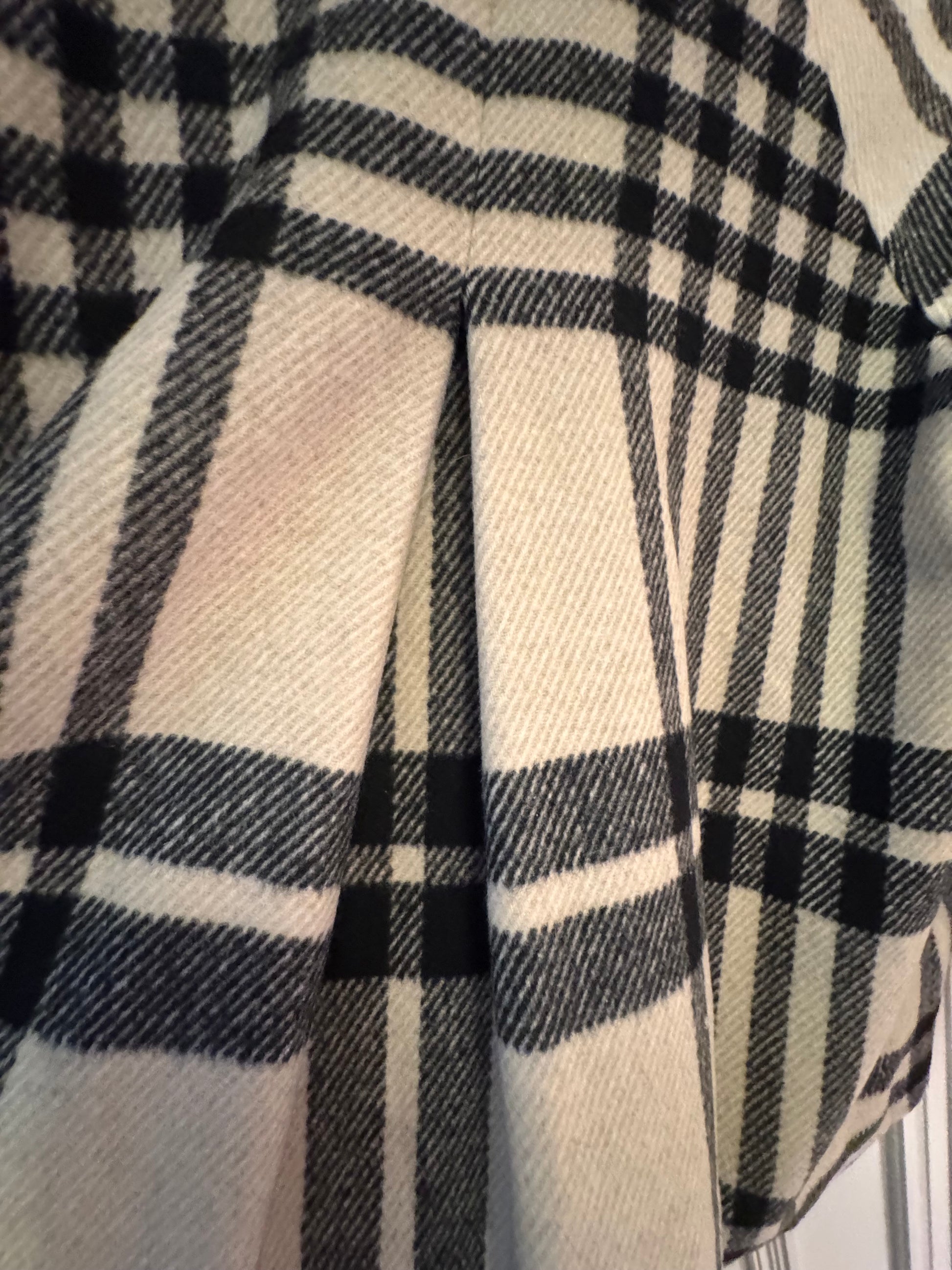 Upea villakangastakki, jossa tyylikäs laskos takana ja kevyesti A-linjainen malli. Vaalea meleerattu pohjaväri, jossa elegantit mustat ruudut. Takki on vuorattu pehmeällä bambuviskoosivuorilla, joka tuntuu miellyttävältä ihoa vasten. Edessä kauniit napit viimeistelevät ilmeen.