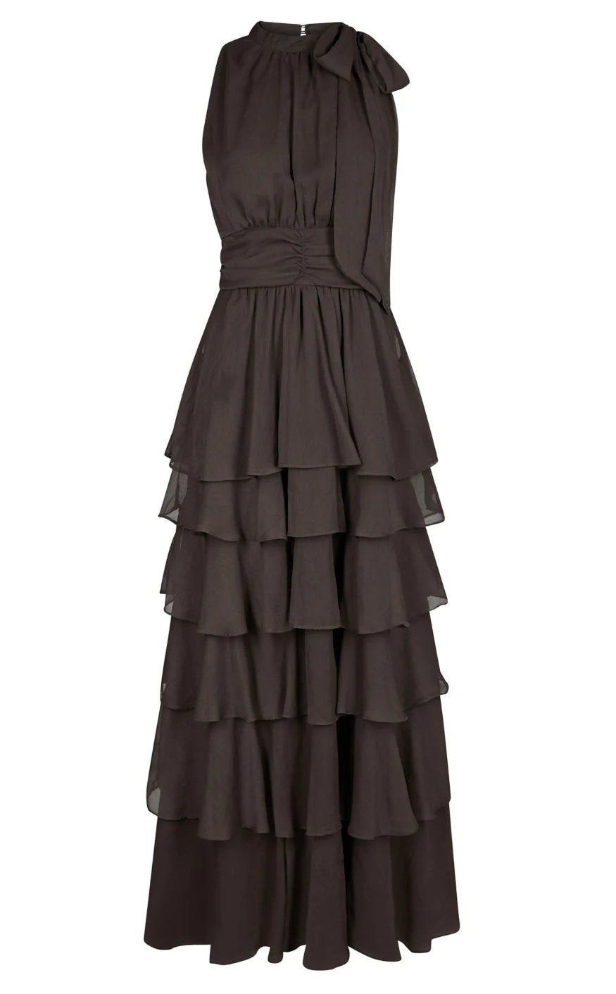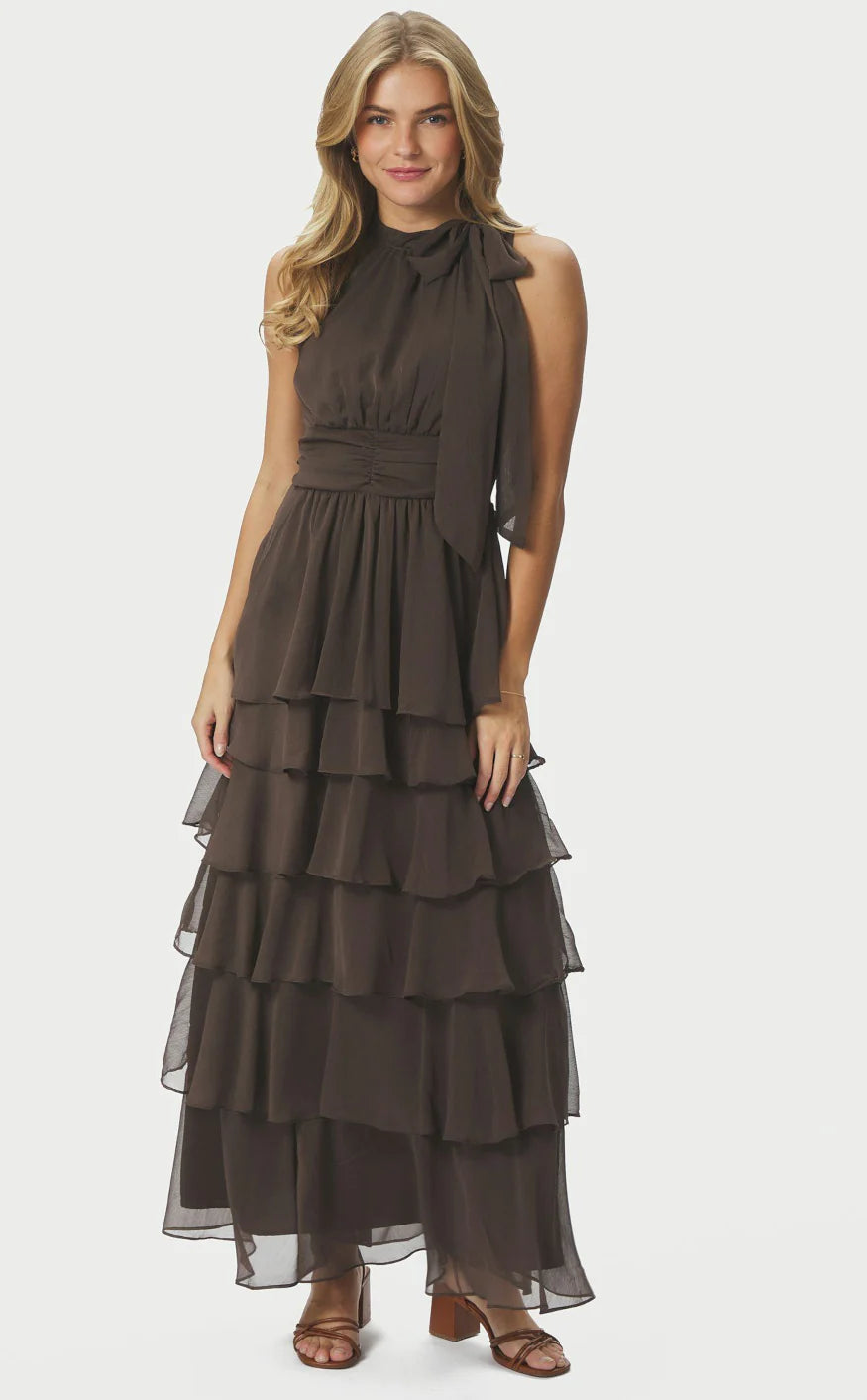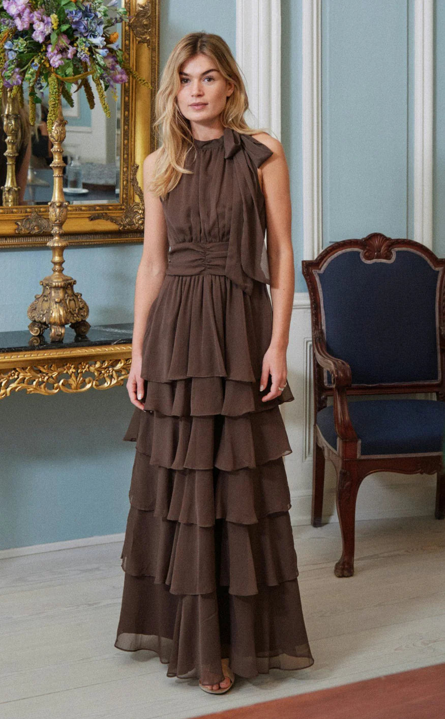 Pitkä mekko, joka solmitaan niskasta. Mekossa on rinnan alla smokkirypytys ja alhaalla väljä, kauniisti laskeutuva helma. Malli on 176 cm pitkä ja käyttää .