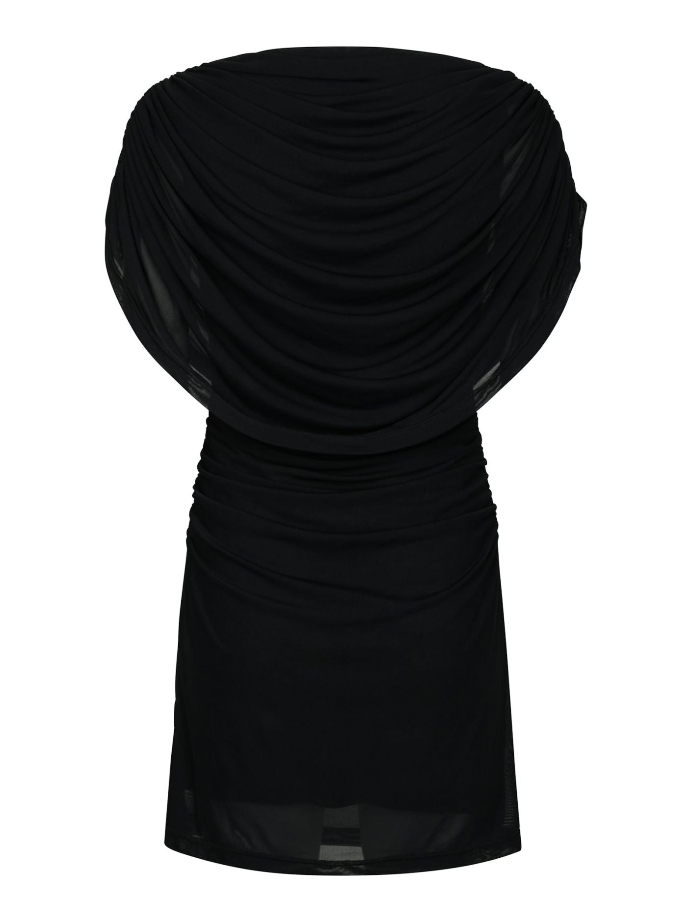 Söpö lyhyt verkkokangasmekko, jossa on smokkirypytys sivusaumassa sekä kauniisti laskeutuva vesiputousmainen drapeeraus etupääntiessä. Malli on 176 cm pitkä ja käyttää kokoa 36.