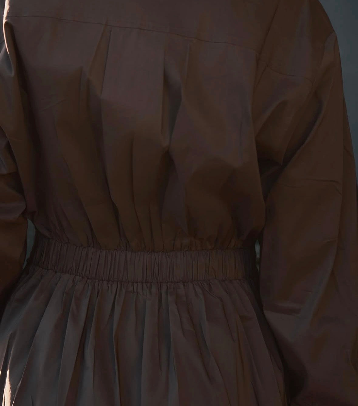 Kaunis suklaanruskea mekko. Takana kuminauha ja edessä napitus; mekko on epäsymmetrinen, ns. kietaisumallinen.