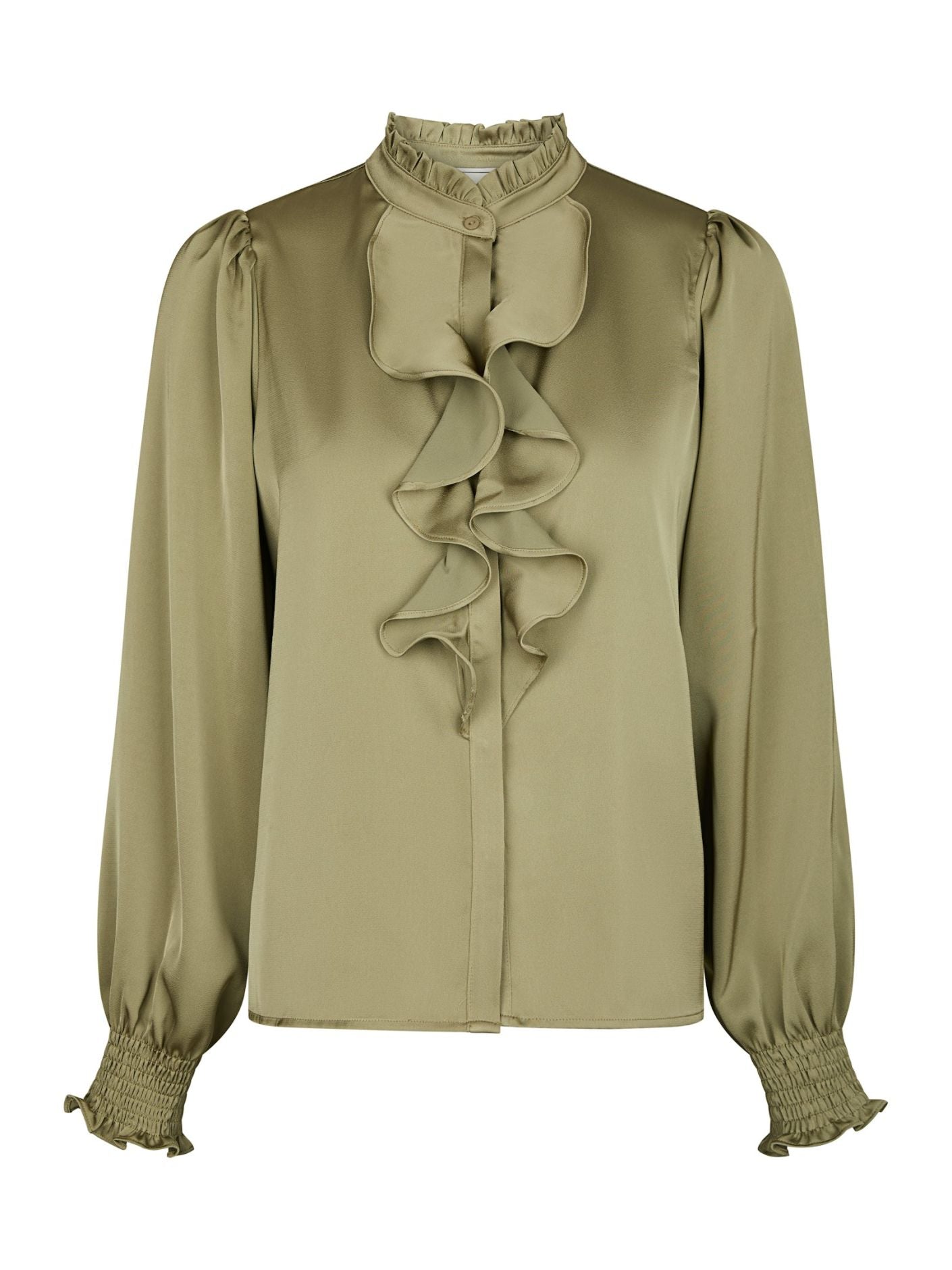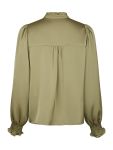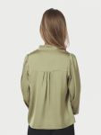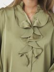 Kaunis pusero, jossa on laskostetut röyhelöyksityiskohdat nappilistassa. Puserossa on väljä istuvuus ja se on valmistettu miellyttävän pehmeästä satiinilaadusta. Malli on 176 cm pitkä ja käyttää kokoa 36.