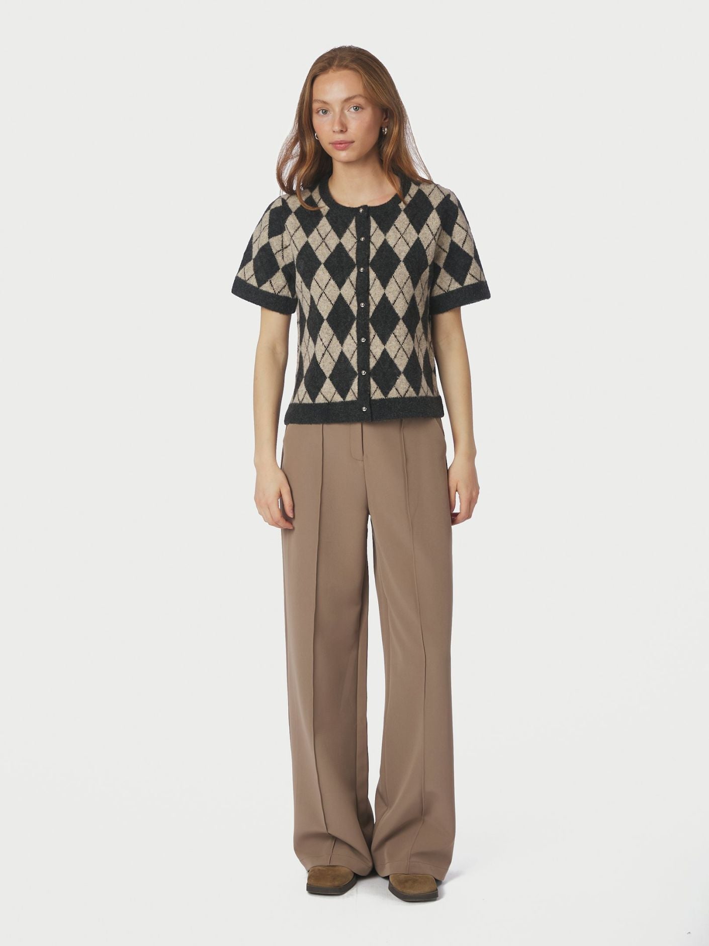 Neuletakki, jossa on tyylikäs argyle-kuvio. Neuletakissa on lyhyet hihat ja edessä nappikiinnitys. Malli on 176 cm pitkä ja käyttää kokoa 36. Pienempää kokoa. Materiaali: 47 % polyesteri / 40 % akryyli / 10 % villa / 3 % elastaani Väri: beige musta