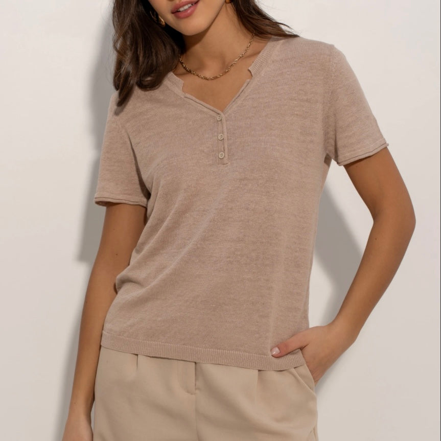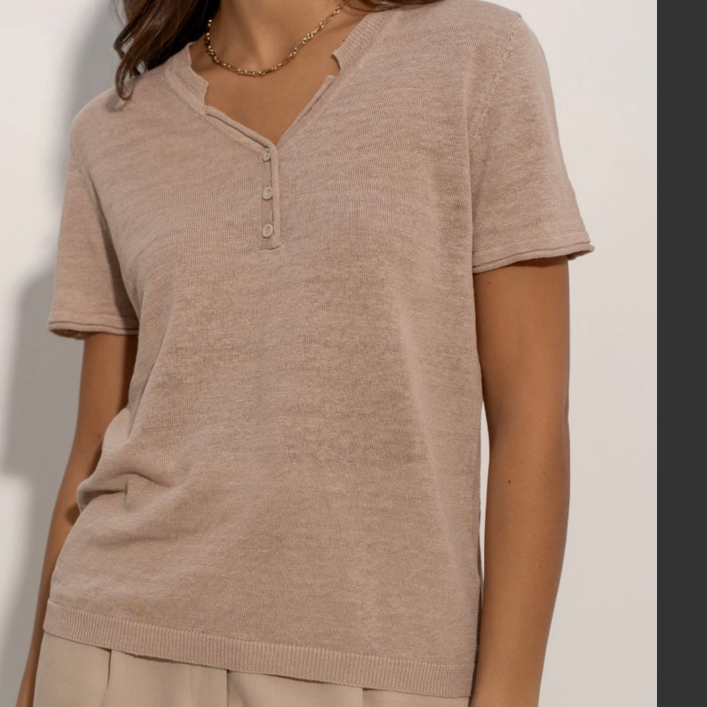 Tämä pellavainen t-paita henkii vanhan maailman eleganssia ja ranskalaisen elokuvan charmia. Tunnet sen hengittävästä, kevyestä materiaalista, joka laskeutuu täydellisesti ja tuntuu iholla luonnollisen pehmeältä.