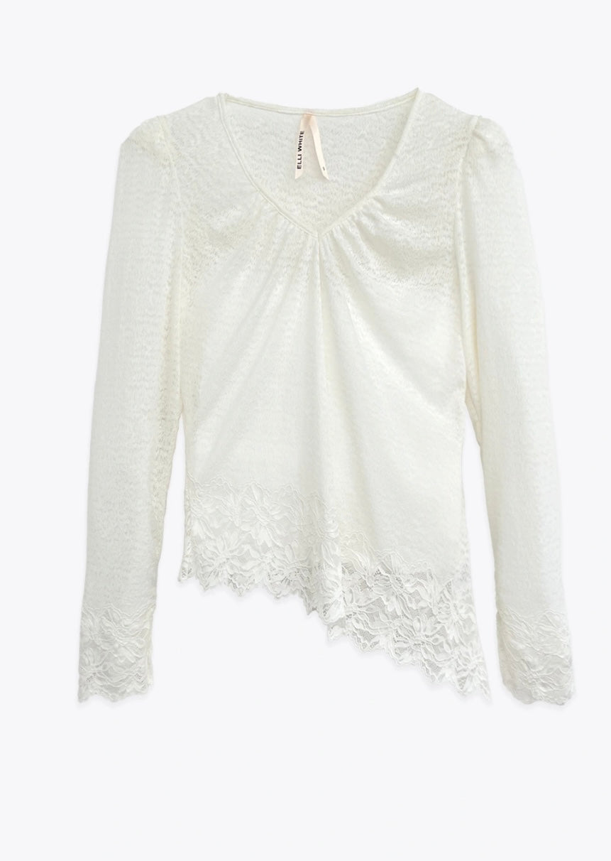 Hienostunut pitsipaita läpikuultavalla materiaalilla, V-pääntiellä ja pitkillä hihoilla.