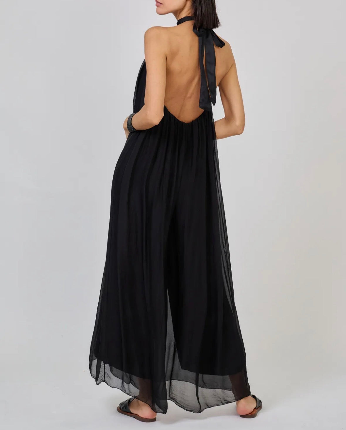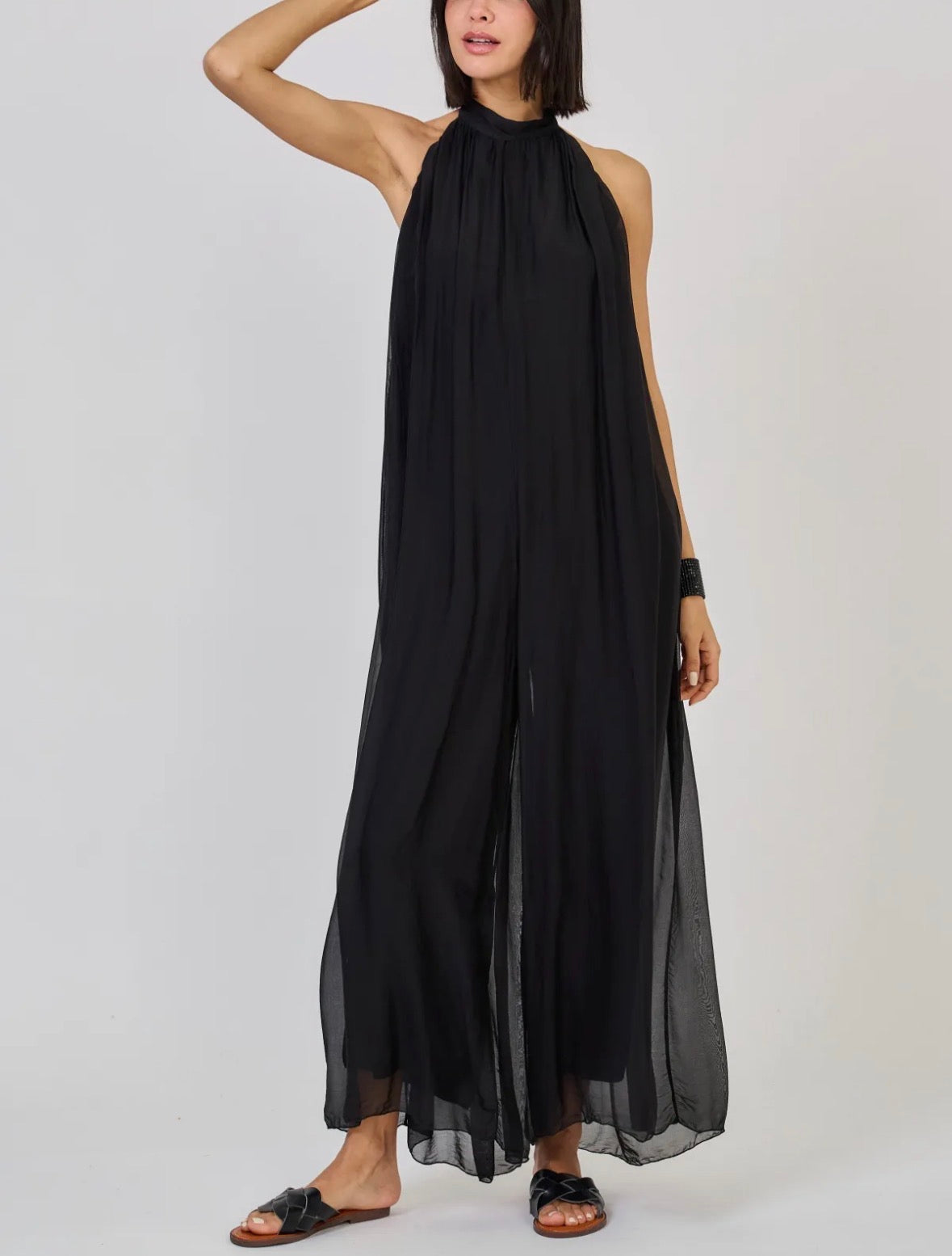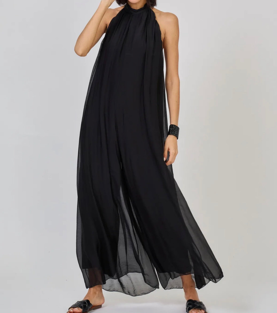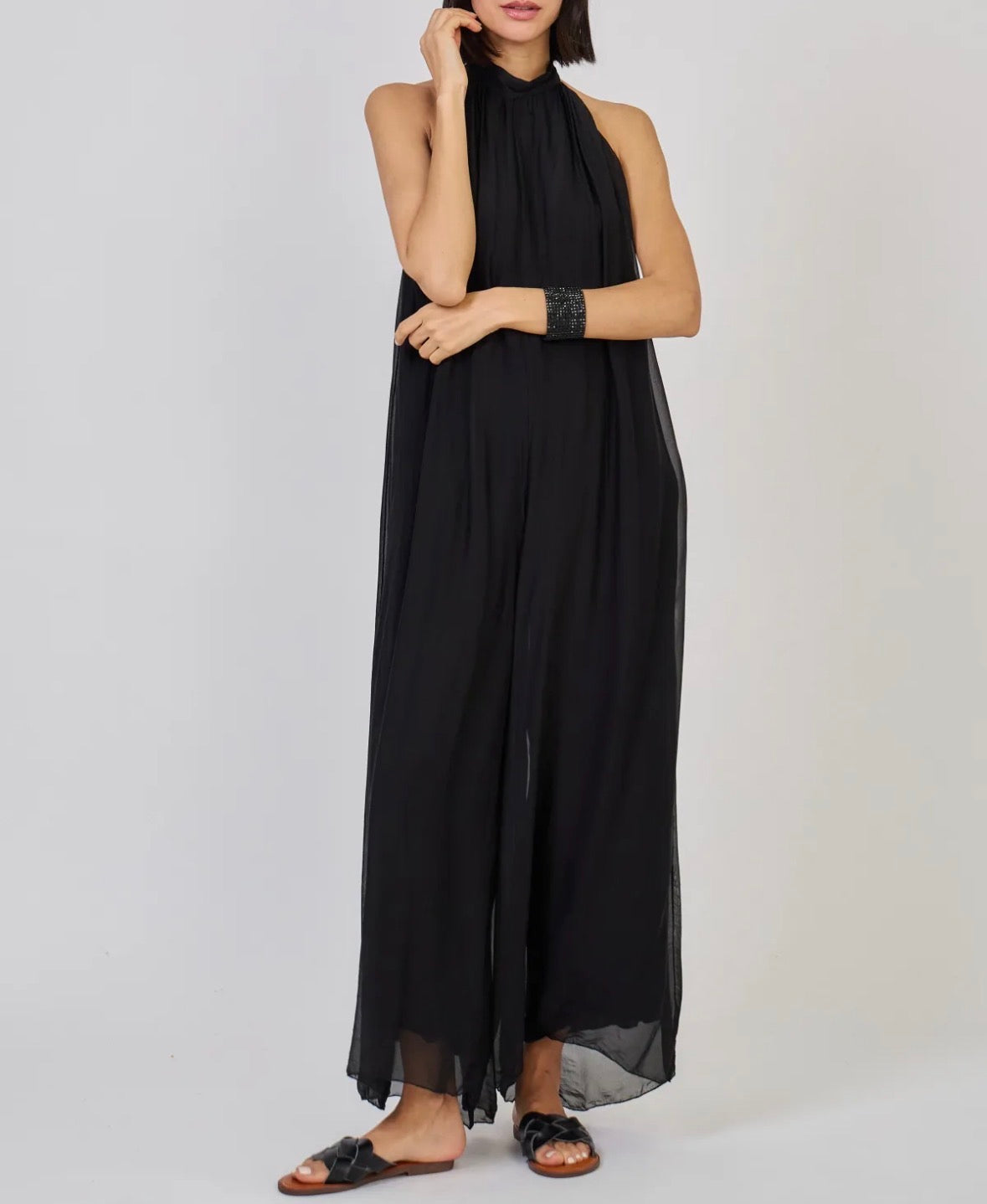 Ihanasti laskeutuva, kauniisti liikkuva silkkisekoitteinen maksihaalari huokuu eleganssia. Upeasti avoin selkä ja halterneck-kiinnitys korostavat naisellista siluettia. Täyspitkä vuori tekee haalarista miellyttävän ja helppokäyttöisen. Materiaalin hienostunut hohto ja höyhenenkevyt tuntu tekevät tästä asusta luottovalinnan, johon haluat pukeutua yhä uudelleen.