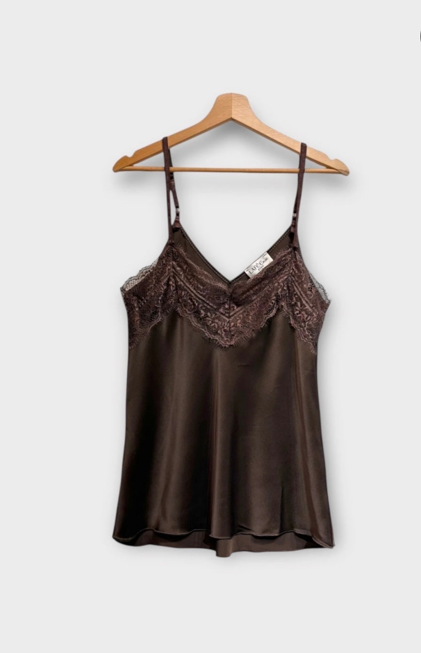 Hento yksivärinen toppi, jossa pitsiä ja säädettävät olkaimet.