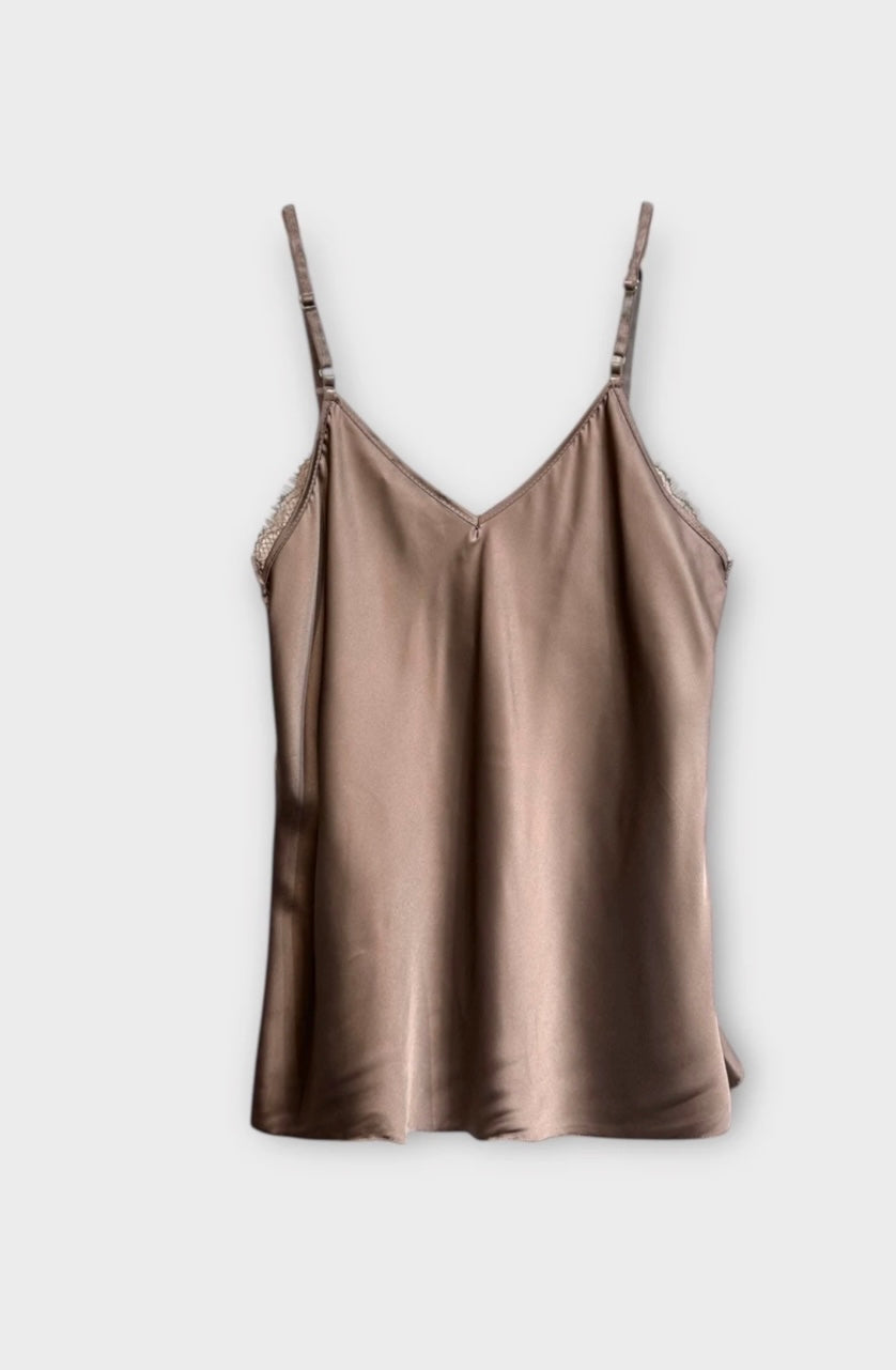 Hento yksivärinen toppi, jossa pitsiä ja säädettävät olkaimet.